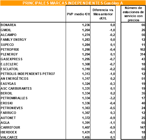 BonÀrea fue de nuevo la marca independiente con los precios más bajos. Le siguió Gmoil y Alcampo. Las independientes menos económicas fueron Valcarce, Carrefour e Iberdoex.
