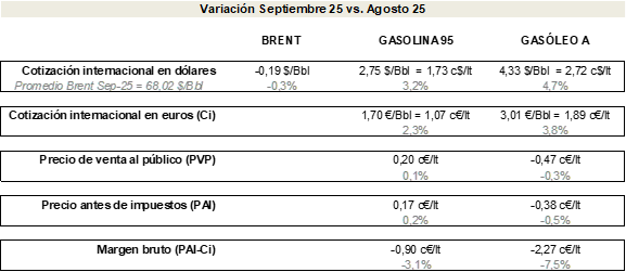 En septiembre de 2025, el PVP promedio de la gasolina 95 aumentó, tras el descenso del mes anterior, situándose en 1,491 €/lt (+0,1%; +0,20 c€/lt). Por el contrario, el PVP promedio del gasóleo A se redujo, por segundo mes consecutivo, hasta 1,420 €/lt (-0,3%; -0,47 c€/lt). El mercado internacional continuó expectante debatiéndose entre factores alcistas (incertidumbre en torno a los conflictos Israel-Palestina y Rusia-Ucrania) compensados con presiones a la baja (plan de incrementos de producción de la OPEP al objeto de recuperar cuota de mercado).