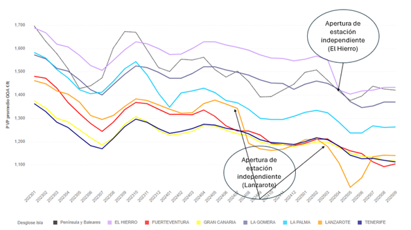 Como ejemplo de lo que explicamos, están la reciente apertura de la primera estación independiente en El Hierro en marzo de este año o las primeras estaciones Plenergy en julio de 2024 y febrero de 2025 en Lanzarote. Podéis verlo en este gráfico: