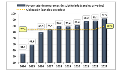 El subtitulado es, con diferencia, el servicio de accesibilidad más extendido. Hoy en día, prácticamente toda la programación de la televisión en abierto está subtitulada, con porcentajes cercanos al 100 % tanto en operadores públicos como privados.